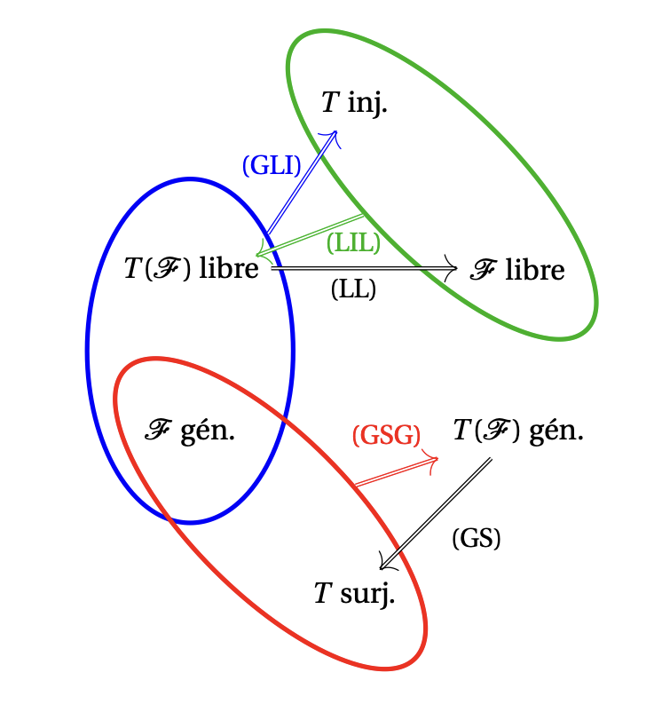 On montre d'abord l'implication (LL). On suppose que \(T(\mathcal{F}) = \{ T(v_1), \dots, T(v_r) \} \subseteq V'\) est libre. Considérons une combinaison linéaire nulle des éléments de \(\mathcal{F}\) donnée par \[ \mathbf{0}_{V} = \alpha_1 v_1+\cdots+\alpha_r v_r. \] Alors, la linéarité de \(T\) nous dit que \[ \mathbf{0}_{V'} = T(\mathbf{0}_{V'}) = T(\alpha_1 v_1+\cdots+\alpha_r v_r) = \alpha_1 T(v_1)+\cdots+\alpha_r T(v_r). \] Comme \(T(\mathcal{F}) = \{ T(v_1), \dots, T(v_r) \} \subseteq V'\) est libre, on déduit que \(\alpha_1=\dots=\alpha_r=0\), i.e. \(\mathcal{F}\) est libre. On prouve ensuite l'implication (LL). On suppose que \(T(\mathcal{F}) = \{ T(v_1), \dots, T(v_r) \} \subseteq V'\) est une famille génératrice de \(V'\). Alors, pour tout \(v' \in V'\) il existe \(\alpha_1 , \dots, \alpha_r \in \mathbb{R}\) tels que \[ v' = \alpha_1 T(v_1)+\cdots+\alpha_r T(v_r) = T(\alpha_1 v_1+\cdots+\alpha_r v_r), \] où l'on a utilisé la linéarité de \(T\) dans la dernière égalité. En conséquence, \(v' \in \mathrm{Im} (T)\), ce qui nous dit que \(T\) est surjective. On montre maintenant l'implication (LIL). On suppose que \(T\) est une application linéaire injective, et on va montrer que \(T(\mathcal{F}) = \{ T(v_1), \dots, T(v_r) \} \subseteq V'\) est libre. Considérons une combinaison linéaire nulle des éléments de \(T(\mathcal{F})\), \[ \mathbf{0}_{V'}=\alpha_1 T(v_1)+\cdots +\alpha_r T(v_r)=T(\alpha_1 v_1+\cdots +\alpha_r v_r)\,. \] Comme \(T\) est injective, on a \(\alpha_1v_1+\cdots +\alpha_r v_r=\mathbf{0}_{V}\), et comme \(\mathcal{F}\) est une libre, on en déduit que \(\alpha_1=\dots=\alpha_r=0\), i.e. \(T(\mathcal{F})\) est libre. On prouve puis l'implication (GLI). On suppose que \( \mathcal{F} = \{ v_1, \dots, v_r \} \subseteq V\) est une famille génératrice de \(V\) et \(T(\mathcal{F}) = \{ T(v_1), \dots, T(v_r) \} \subseteq V'\) est libre. On va montrer que \(T\) est injective. Soient \(v, w \in V\) tels que \(T(v) = T(w)\). Alors, comme \( \mathcal{F}\) est une famille génératrice de \(V\), il existe \(\alpha_1 , \beta_1 \dots, \alpha_r, \beta_r \in \mathbb{R}\) tels que \[ v = \alpha_1 v_1+\cdots+\alpha_r v_r \qquad \text{ et } \qquad w = \beta_1 v_1+\cdots+\beta_r v_r. \] Or, \(T(v) = T(w)\) nous dit que \[ \alpha_1 T(v_1)+\cdots+\alpha_r T(v_r) = T(\alpha_1 v_1+\cdots+\alpha_r v_r) = T(v) = T(w) = T(\beta_1 v_1+\cdots+\beta_r v_r) = \beta_1 T(v_1)+\cdots+\beta_r T(v_r), \] ce qui implique que \[ (\alpha_1 - \beta_1) T(v_1)+\cdots+ (\alpha_r - \beta_r)T(v_r) = \mathbf{0}_{V'}. \] Comme \(T(\mathcal{F})\) est libre, on conclut que \(\alpha_1 - \beta_1 = 0\), \dots, \(\alpha_r - \beta_r = 0\), i.e. \(\alpha_1 = \beta_1\), \dots, \(\alpha_r = \beta_r\), ce qui implique \[ v = \alpha_1 v_1+\cdots+\alpha_r v_r = \beta_1 v_1+\cdots+\beta_r v_r = w. \] En conséquence, \(T\) est injective. On montre l'implication dans (GSG). On suppose que \( \mathcal{F} = \{ v_1, \dots, v_r \} \subseteq V\) est une famille génératrice de \(V\) et \(T\) est surjective. On va montrer que \(T(\mathcal{F}) = \{ T(v_1), \dots, T(v_r) \} \subseteq V'\) est une famille génératrice de \(V'\). Soit \( v' \in V'\). Comme \(T\) est surjective, il existe \( v \in V\) tel que \(T(v) = v'\). Comme \( \mathcal{F} = \{ v_1, \dots, v_r \} \subseteq V\) est une famille génératrice de \(V\), il existe \(\alpha_1 , \dots, \alpha_r \in \mathbb{R}\) tels que \[ v = \alpha_1 v_1+\cdots+\alpha_r v_r. \] En conséquence, \[ v' = T(v) = T(\alpha_1 v_1+\cdots+\alpha_r v_r) = \alpha_1 T(v_1)+\cdots+\alpha_r T(v_r), \] ce qui implique que \(v' \in \mathrm{Vect}{T(\mathcal{F})}\), i.e. \(T(\mathcal{F}) = \{ T(v_1), \dots, T(v_r) \} \subseteq V'\) est une famille génératrice de \(V'\). Finalement, pour prouver la dernière partie, on note que si \(T\) est bijective et \(\mathcal{B}=\{v_1,\dots,v_p\}\) une base de \(V\), alors (LIL) et (GSG) nous disent que \(T(\mathcal{B})=\{T(v_1),\dots,T(v_p)\}\) est une base de \(V'\). Réciproquement, étant donné une base \(\mathcal{B}=\{v_1,\dots,v_p\}\) de \(V\), si \(T(\mathcal{B})=\{T(v_1),\dots,T(v_p)\}\) est une base de \(V'\), (GLI) et (GS) nous disent que \(T\) est bijective.