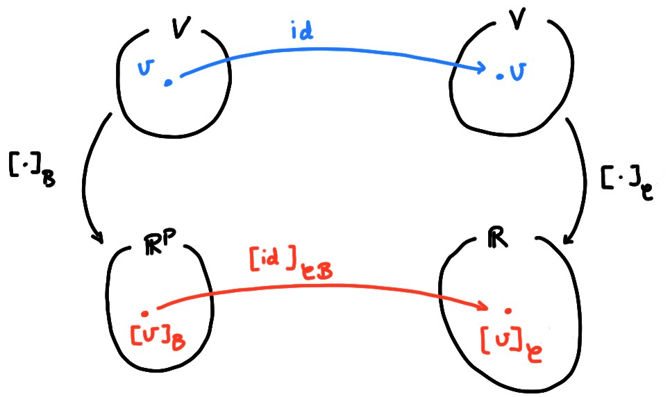 Par définition, la matrice qui représente \(\mathrm{id}\) relativement aux bases \(\mathcal{B}\) et \(\mathcal{C}\), est celle qui permet d'obtenir \([v]_{\mathcal{C}}\) à partir de \([v]_{\mathcal{B}}\): \[ [v]_{\mathcal{C}}=[\mathrm{id}]_{\mathcal{C}\mathcal{B}}[v]_{\mathcal{B}}. \] Cette matrice est donc précisément notre matrice de changement de base: \[ P_{\mathcal{C}\mathcal{B}}=[\mathrm{id}]_{\mathcal{C}\mathcal{B}}\,. \]