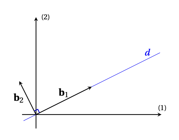 \(\mathcal{B}=\{\boldsymbol{b}_1,\boldsymbol{b}_2\}\) où \(\boldsymbol{b}_1\) dirige \(d\), et \(\boldsymbol{b}_2\)