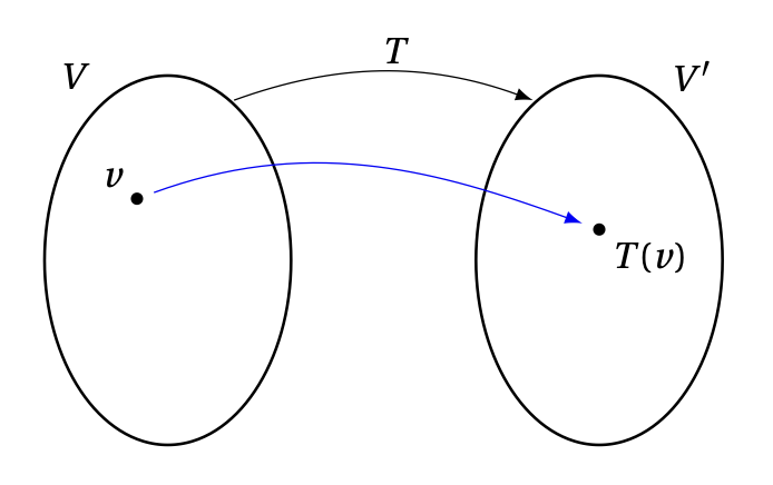 Considérons deux espaces vectoriels, \(V\) et \(V'\), ainsi qu'une application linéaire \(T:V\to V'\).