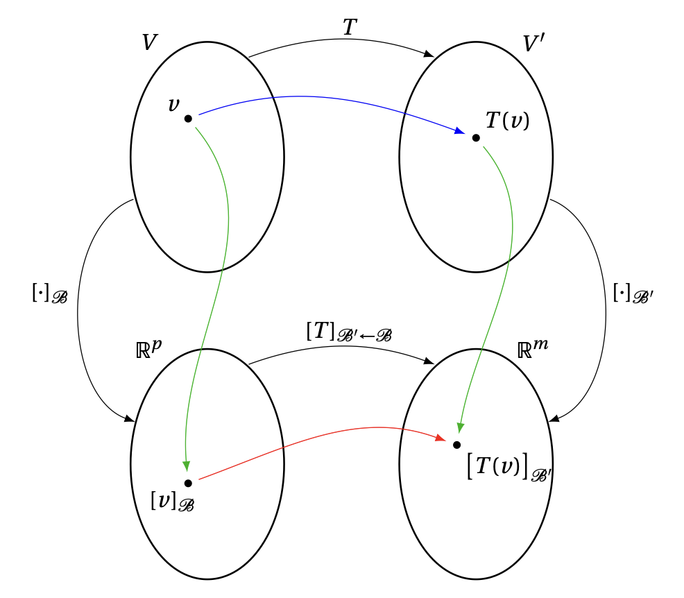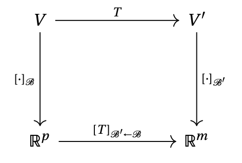 En utilisant les bases \(\mathcal{B}\) et \(\mathcal{B}'\), ainsi que les applications \([\cdot]_{\mathcal{B}}\) et \([\cdot]_{\mathcal{B}'}\) qui leur sont associées, nous avons pu prendre l'application \[{\color{blue}v\mapsto T(v)}\,\] qui est abstraite, et nous l'avons rendue plus concrète, en la représentant à l'aide d'une matrice: on peut maintenant la voir comme une application linéaire de \(\mathbb{R}^p\) dans \(\mathbb{R}^m\), dont la matrice est \([T]_{\mathcal{B}'\mathcal{B}}\): \[ \underbrace{{\color{red}[v]_\mathcal{B}}}_{\in \mathbb{R}^p} \,\, {\color{red}\mapsto} \,\, \underbrace{{\color{red}\big[T(v)\big]_{\mathcal{B}'}}}_{\in \mathbb{R}^m} = {\color{red} [T]_{\mathcal{B}'\leftarrow\mathcal{B}} [v]_\mathcal{B} }\,. \] En conséquence, l'étude de \(T\) peut se réduire à celle de la matrice \([T]_{\mathcal{B}'\leftarrow\mathcal{B}}\).