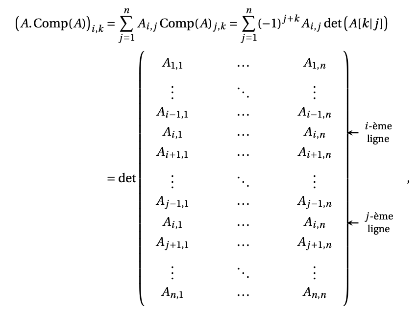 On montrera l'identité \( A.\operatorname{Comp}(A) = \det(A) I_n \), la preuve de l'autre identité est analogue. Or, par définition du produit de matrices on a que \[ \big(A.\operatorname{Comp}(A)\big)_{i,k} = \sum_{j=1}^n A_{i,j} \operatorname{Comp}(A)_{j,k} = \sum_{j=1}^n (-1)^{j+k} A_{i,j} \det\big(A[k|j]\big). \] Si \(i = k\), alors \[ \big(A.\operatorname{Comp}(A)\big)_{i,i} = \sum_{j=1}^n A_{i,j} \operatorname{Comp}(A)_{j,i} = \sum_{j=1}^n (-1)^{i+j} A_{i,j} \det\big(A[i|j]\big) = \det(A) = \det(A) \big(I_n\big)_{i,i}, \] où l'on a utilisé le premier Théorème de la Section (cliquer) dans la troisième égalité, en développant selon l'\(i\)-ème ligne de \(A\). Si \(i \neq k\), alors