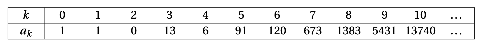 Si l'on pose \(a_k = (-4 (-2)^k + 7 (-1)^k + 3^k)/4\), on trouve ainsi
