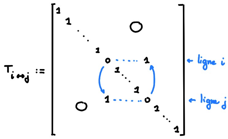 Maintenant, pour effectuer une transformation \(\mathcal{E}\) sur une matrice \(A\) (\(n\times p\)), on pourra simplement considérer la matrice élémentaire \(E\) (\(n\times n\)) obtenue en effectuant \(\mathcal{E}\) sur \(I_n\), puis l'utiliser pour multiplier \(A\) à gauche par \(E\): le résultat \(EA\) est alors la matrice \(A\) sur laquelle on a effectué \(\mathcal{E}\).