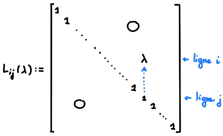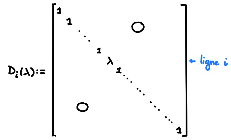 Pour le vérifier, écrivons explicitement les matrices élémentaires \(n\times n\), ainsi que leurs inverses.