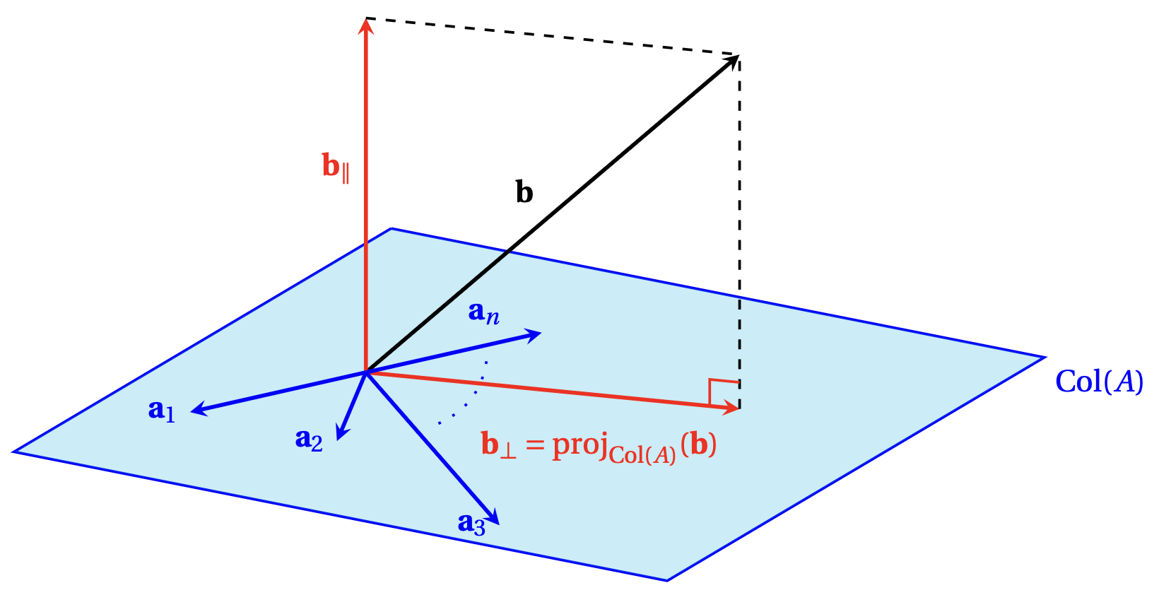Si \(\hat{\boldsymbol{x}}\in\mathbb{R}^n\) est solution de \(A\boldsymbol{x}=\boldsymbol{b}\) au sens des moindres carrés, alors le premier théorème de cette section nous dit que \(A\boldsymbol{x}=\mathrm{proj}_{\mathrm{Col}(A)}(\boldsymbol{b})\). Or, on rappelle que \(\boldsymbol{b}_\parallel=\mathrm{proj}_{\mathrm{Col}(A)}(\boldsymbol{b})\) est caractérisé par le fait que \(\boldsymbol{b}_\perp:= \boldsymbol{b}-\boldsymbol{b}_\parallel\) est orthogonal à \(\mathrm{Col}(A)\), i.e. \(\boldsymbol{b}_\perp\in \mathrm{Col}(A)^\perp\):