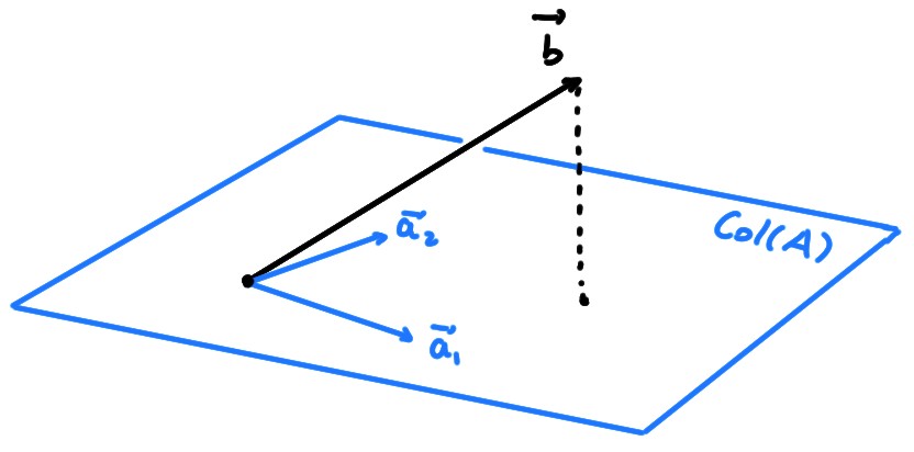 Cette image suggère que malgré tout, si on ne peut pas trouver de paire telle que la combinaison linéaire \(\alpha \boldsymbol{a}_1+\beta\boldsymbol{a}_2\) soit exactement égale à \(\boldsymbol{b}\), on pourrait chercher la paire telle que la combinaison linéaire \(\alpha \boldsymbol{a}_1+\beta\boldsymbol{a}_2\) soit aussi proche que possible de \(\boldsymbol{b}\), c'est à dire la paire \((\alpha,\beta)\) qui minimise la distance \[ \bigl\|(\alpha\boldsymbol{a}_1+\beta\boldsymbol{a}_2)-\boldsymbol{b}\bigr\|\,. \] On sait, par les résultats démontrés dans le chapitre précédent, que la combinaison linéaire qui réalise ce minimum est précisément celle qui est égale à la projection de \(\boldsymbol{b}\) sur l'espace engendré par \(\boldsymbol{a}_1\) et \(\boldsymbol{a}_2\), à savoir \(\mathrm{Col}(A)\):
