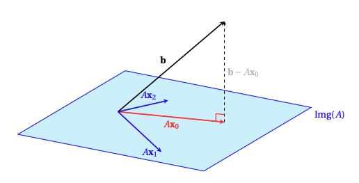 La raison fondamentale pour laquelle on s'intéresse aux notions de distance et de perpendicularité est due au problème suivant. Souvent on va se rencontrer avec des système d'équations linéaires \(A \boldsymbol{x} = \boldsymbol{b}\), où \(A\) est une matrice de taille \(m \times n\) et \(\boldsymbol{b} \in \mathbb{R}^m\), qui sont incompatibles, i.e. qui n'ont pas de solution. Jusqu'à maintenant, on s'est contenté de dire uniquement qu'ils n'admettent pas de solution. Par contre, même si ces systèmes d'équations linéaires n'ont pas de solution au sens strict, on peut considérer des points qui sont les plus proches à être une solution, i.e. des éléments \(\boldsymbol{x}_0 \in \mathbb{R}^n\) tels que \[ \text{distance entre } A \boldsymbol{x}_0 \text{ et } \boldsymbol{b} \text{ soit minimale. } \] On verra les détails de ces calculs, et en particulier comment calculer les vecteurs qui minimisent la distance précédente dans le chapitre suivant. La perpendicularité rentre dans ce problème, car, comme on verra plus tard, la condition de minimalité de la distance précédente est équivalente au fait que \( \boldsymbol{b} - A\boldsymbol{x}_0 \) est orthogonal à tout vecteur de la image \(\mathrm{Im} (A)\) de \(A\).