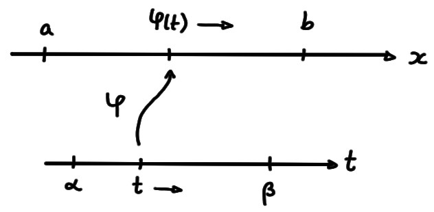 Théorème: Soit \(f:[a,b]\to \mathbb{R}\) continue. Soit aussi \(I\) un intervalle ouvert, \(\varphi:I\to \mathbb{R}\) une fonction de classe \(C^1\). Si \([\alpha,\beta]\subset I\) et si \[ \varphi(t)\in [a,b] \qquad \forall t\in [\alpha,\beta]\,, \] alors \[ \int_\alpha^\beta f(\varphi(t))\varphi'(t)\,dt= \int_{\varphi(\alpha)}^{\varphi(\beta)}f(x)\,dx \]
