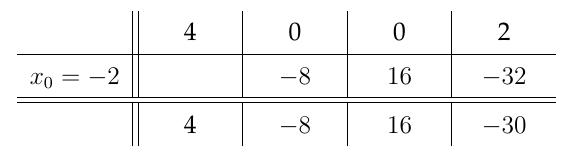 Exemple: Effectuer la division de \(P(x)=4x^3+2\) par \(x+2\).