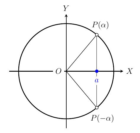 - On cherche un angle \(\alpha\) tel que \(\cos(\alpha)=a\) (par exemple parmi les valeurs remarquables).