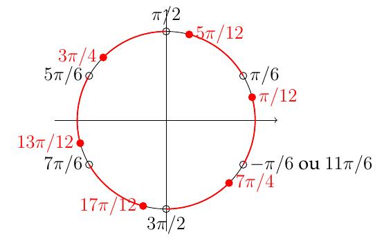 On doit faire attention au fait que l'intervalle \(\displaystyle \left]\frac{-\pi}{6},\frac{\pi}{12}\right]\) n'est pas entièrement contenu dans \([0,2\pi]\). Il faut donc "exploser" l'intervalle en prenant chaque partie dans le bon tour du cercle trigonométrique.