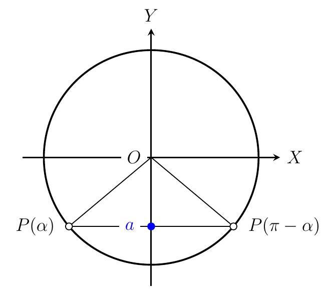 - On doit donc résoudre \(\sin(x)=\sin(\alpha)\). Deux sinus sont égaux si les angles sont les mêmes ou sont supplémentaires, le tout à \(2\pi\) près.