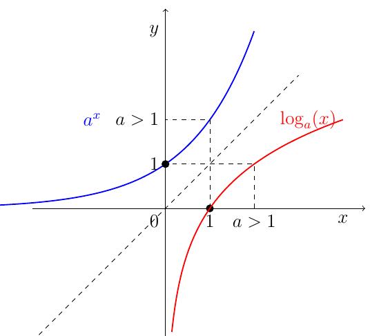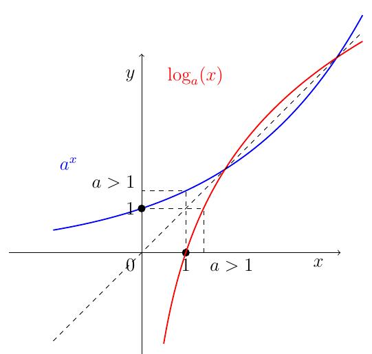 Le graphe de \(\log_a\) s'obtient par symétrie d'axe \(x=y\) à partir du graphe de \(a^x\) (en gris):