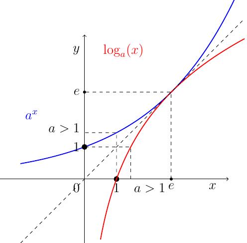 À titre de curiosité, on discute des positions relatives des graphes du logarithme et de l'exponentielle, lorsqu'on change la base \(a\). Cette discussion peut s'accompagner de l'animation du dessus, dans laquelle on peut faire varier \(a\).