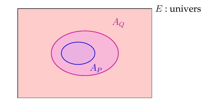 \[P\Rightarrow Q:\forall\,x\in E, \; \text{ si }x\in A_P,\, \text{ alors }x\in
