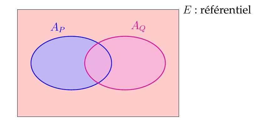 Considérons à présent une autre propriété \(Q\) définie sur \(E\) et \(A_Q\) son ensemble associé. Représentons la situation comme un diagramme de Venn :