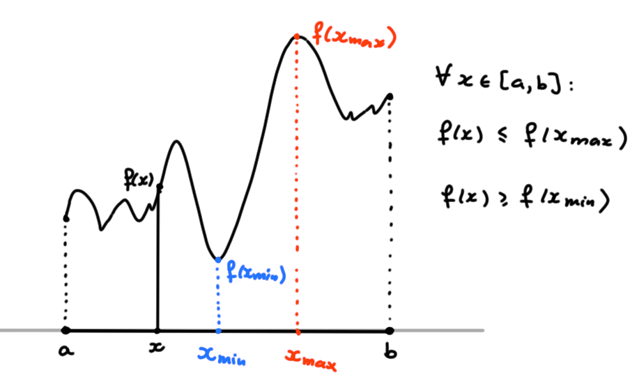 Comme \(f\) y est continue, \(f\) atteint son maximum et son minimum global sur \([a,b]\).
