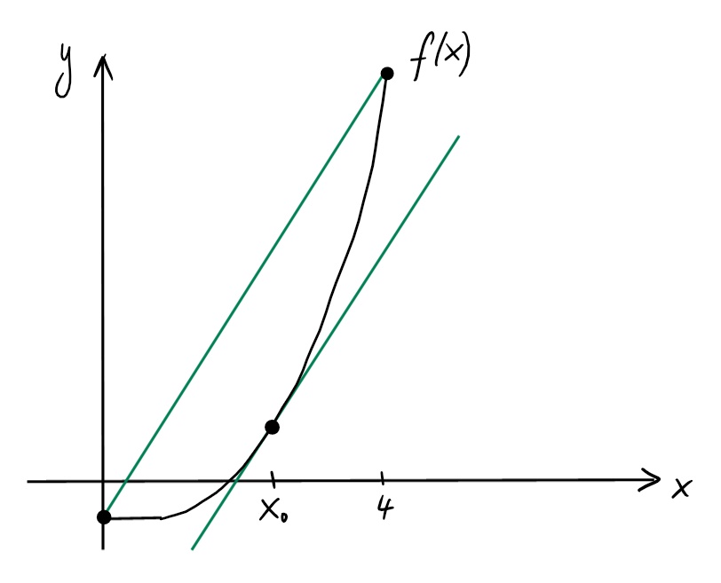 Théorème:[Théorème des accroissements finis (TAF)] Soit \(f\) continue sur \([a,b]\) et dérivable sur \(]a,b[\). Alors il existe \(x_0\in ]a,b[\) tel que \[ f'(x_0)=\frac{f(b)-f(a)}{b-a}\,. \]