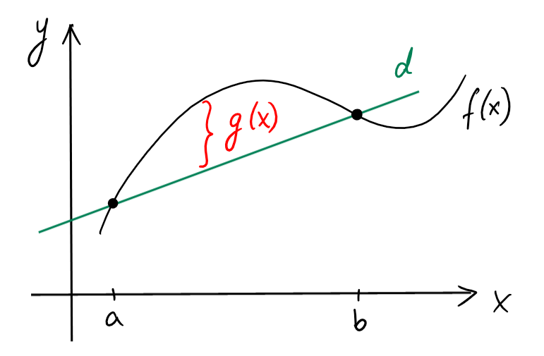 L'équation de la sécante \(d\) passant par \((a,f(a))\) et \((b,f(b))\) est \[y=\left(\frac{f(b)-f(a)}{b-a}\right)\cdot (x-a)+f(a).\]
