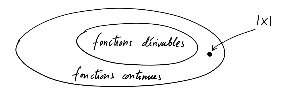 Le théorème ci-dessus nous montre que la continuité est une condition nécessaire pour qu'une fonction soit dérivable. Mais il n'y a pas besoin de montrer séparément la continuité; il suffit de montrer que la fonction est dérivable, et sa continuité est immédiate par le résultat ci-dessus.