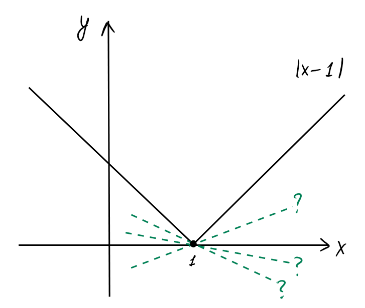 Exemple: Soit \(f(x)=|x-1|\). On a vu plus haut que les dérivées latérales en \(x_0=1\)existent, et que \[ f'_-(1) =-1\,,\qquad f'_+(1)=+1\,. \] Ainsi, \(f'_-(1)\neq f'_+(1)\), et par conséquent le théorème implique que \(f\) n'est pas dérivable en \(1\).