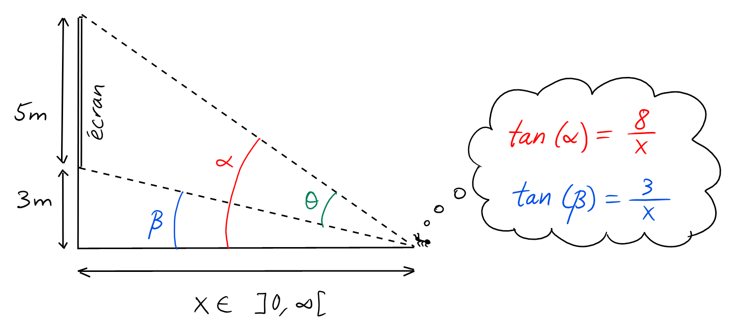 Lorsqu'elle est à distance \(x\) du mur, elle voit l'écran sous un angle