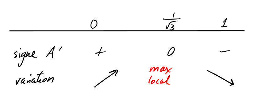 \(x=\frac{1}{\sqrt{3}}\). En ce point,