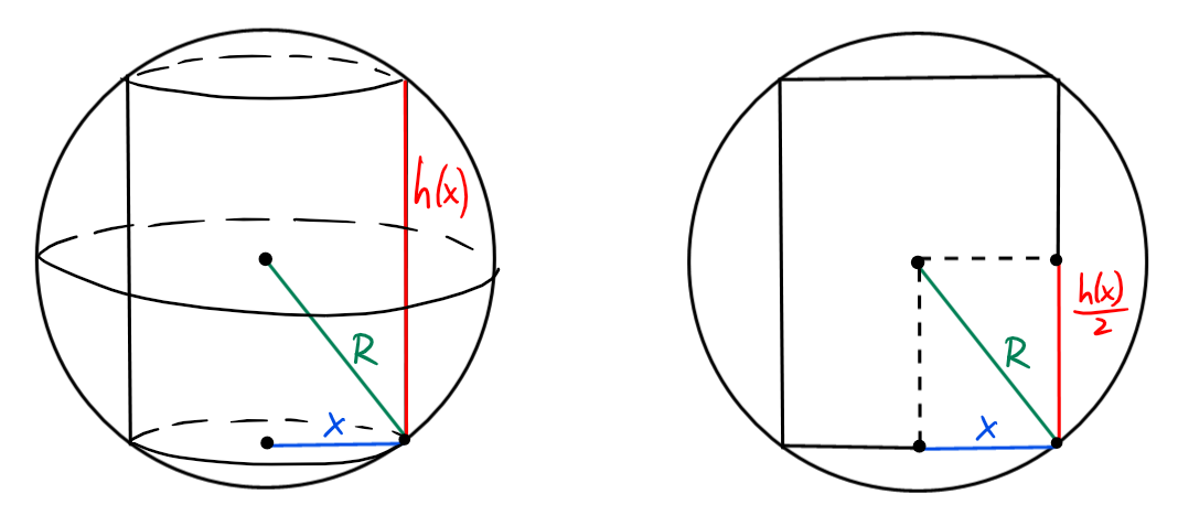 On a \(x^2+\left(\frac{h(x)}{2}\right)^2=R^2\), d'où \(h(x)=2\sqrt{R^2-x^2}\).