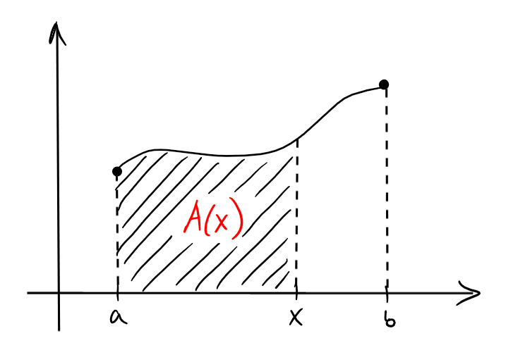 Théorème: (Théorème Fondamental de l'Analyse, 1ère partie) Soit \(f:[a,b]\to \mathbb{R}\) continue, et soit \(A:[a,b]\to \mathbb{R}\) la fonction aire associée. Alors \(A(x)\) est dérivable sur \(]a,b[\) et \[A'(x)=f(x) \quad \forall x\in ]a,b[.\]