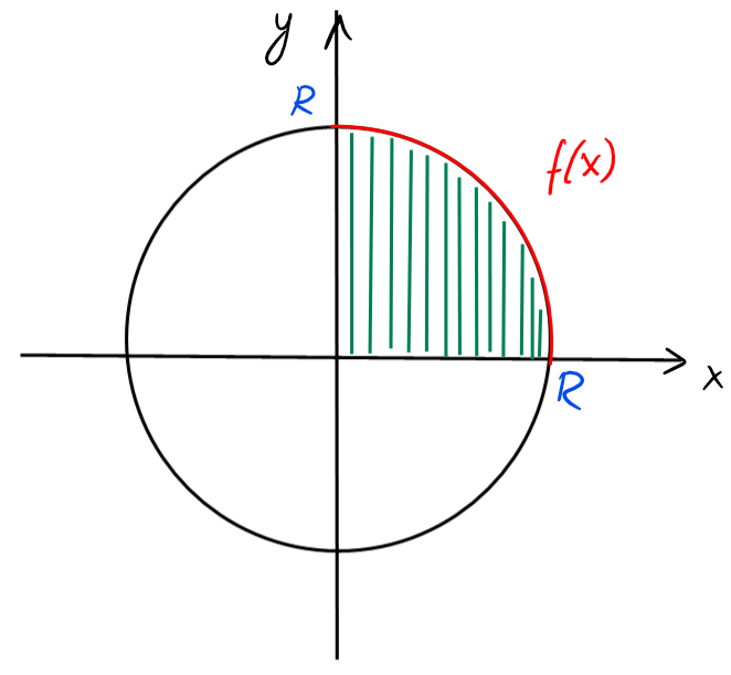 \[y=\sqrt{R^2-x^2}=:f(x).\]