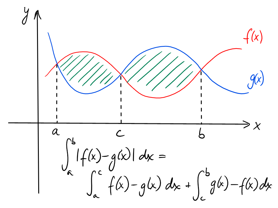 calculer l'aire \(A=\int_a^b |f(x)-g(x)| \ dx\).
