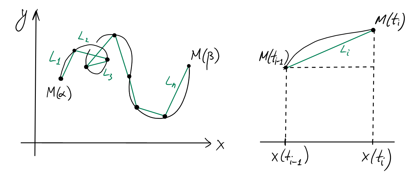 Soit maintenant une courbe paramétrée, \[\begin{aligned} M:[\alpha,\beta]&\to \mathbb{R}^2\\ t&\mapsto M(t)=(x(t),y(t)) \end{aligned}\] telle que les fonctions \(x(t)\) et \(y(t)\) sont dérivables et dont les dérivées sont continues. Comme on a fait plus haut, on prend une subdivision régulière \(\{t_0, t_1, \ldots t_n\}\) de l'intervalle \([\alpha, \beta]\) et on approxime la courbe en prenant sur chaque intervalle \([t_{i-1},t_i]\) le segment de droite reliant \(M(t_{i-1})\) à \(M(t_i)\). Soit \(L_i\) la longueur de ce segment.