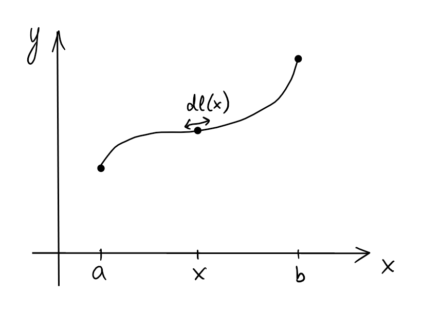 On peut interpréter cette intégrale comme étant \[L=\int_a^b d\ell(x)=\int_a^b \sqrt{1+f'(x)^2} \ dx,\] où \(d\ell(x)=\sqrt{1+f'(x)^2} \ dx\) est l'élément de longueur infinitésimal de la courbe au-dessus du point \(x\):