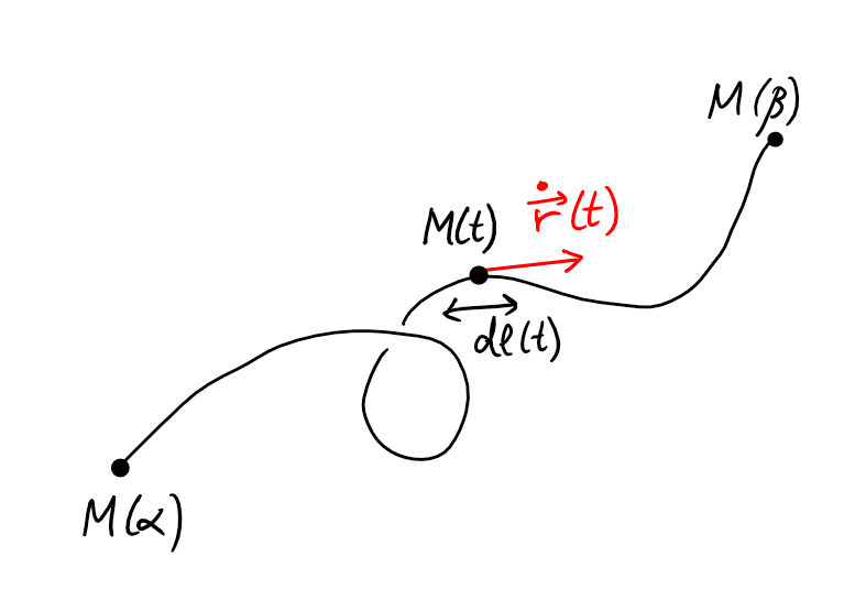 On a \[L=\int_{\alpha}^{\beta} d\ell(t)=L=\int_{\alpha}^{\beta} \|\dot{\vec{r}}(t)\| \ dt,\] où \(d\ell(t)=\|\dot{\vec{r}}(t)\| \ dt\) est l'élément de longueur infinitésimal.