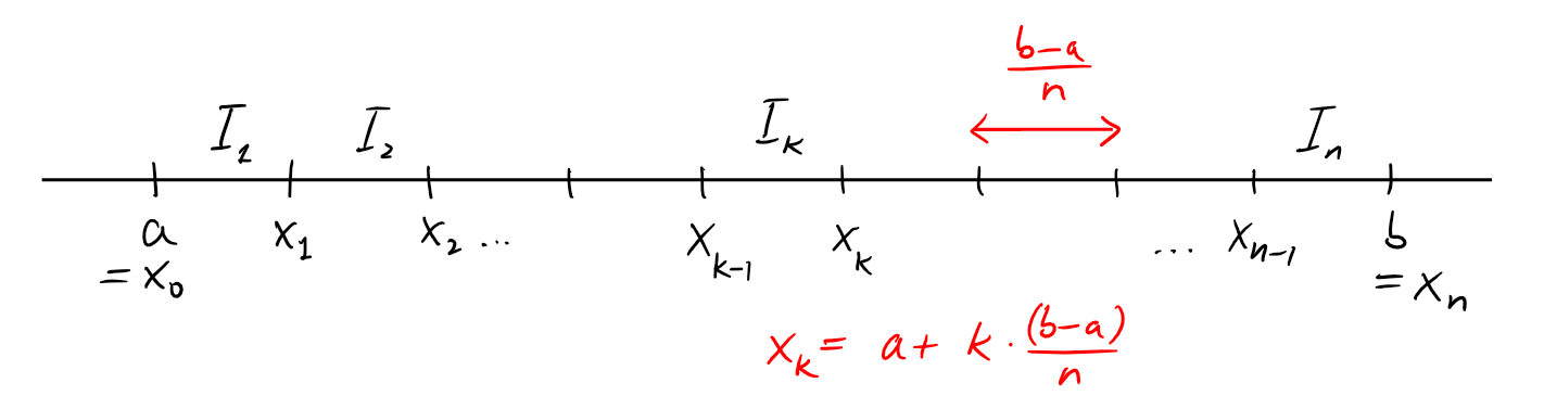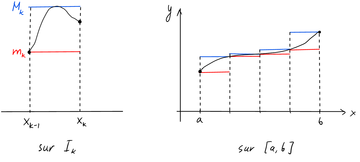 Soient, pour \(k=1,2,\dots,n\), \[\begin{aligned} m_k&:=\min_{x\in I_k} f(x)\\ M_k&:=\max_{x\in I_k} f(x). \end{aligned}\] Ces nombres sont bien définis puisque \(f\) est supposée continue.