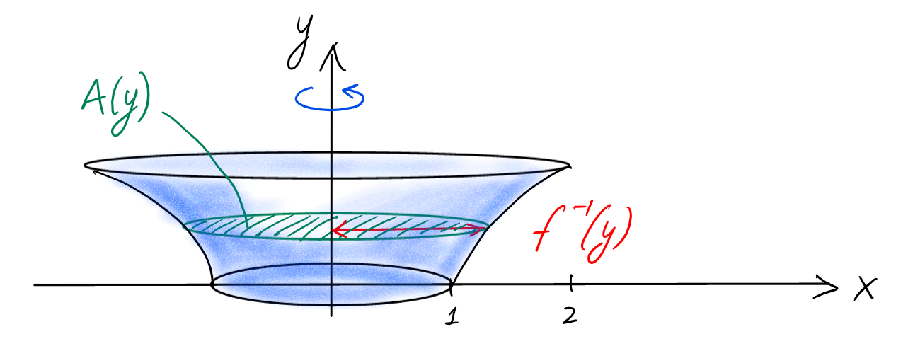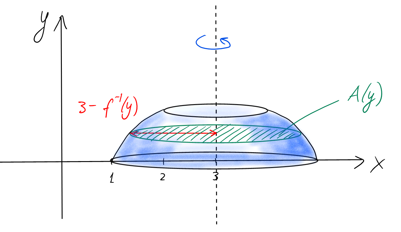 Dans ce cas, la section est un disque de rayon \(3-f^{-1}(y)\), et donc d'aire