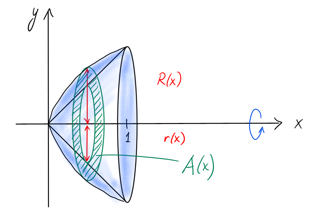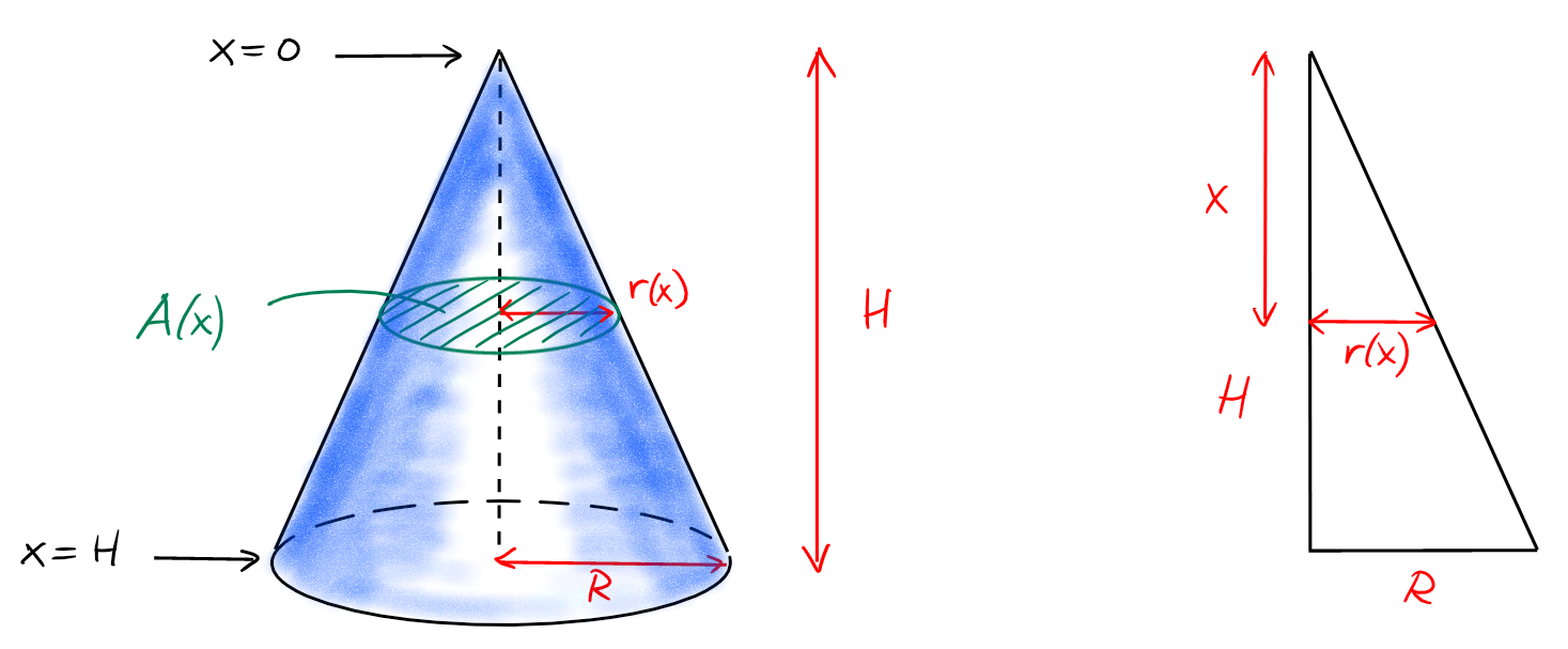 rayon du disque à la hauteur \(x\), et le volume infinitésimal de la tranche
