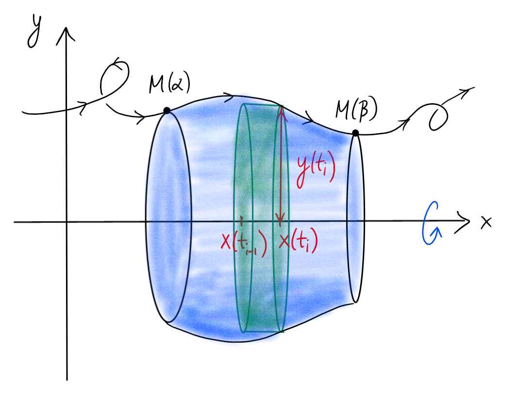 &=\sum_{i=1}^n \underbrace{\pi \cdot y(t_i)^2}_{\text{base}}\cdot [\underbrace{x(t_i)-x(t_{i-1})}_{\text{hauteur}}]\\