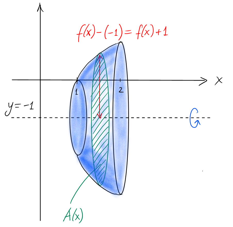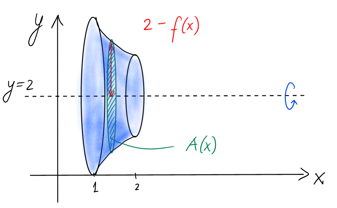\(2-f(x)\), d'aire \(A(x)=\pi(2-f(x))^2\), et donc