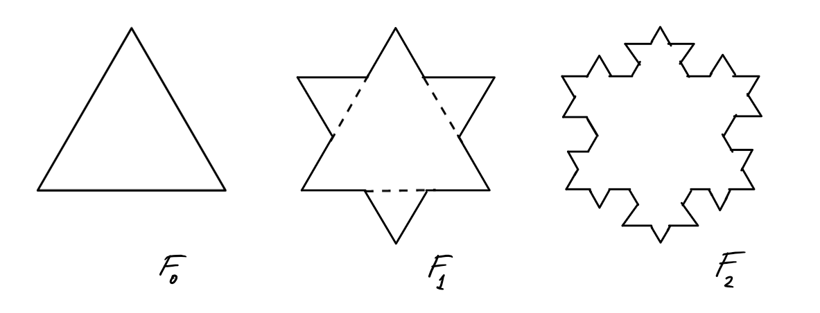 un triangle équilatéral \(F_0\), d'aire \(1\). À chaque étape, on ''colle'' des