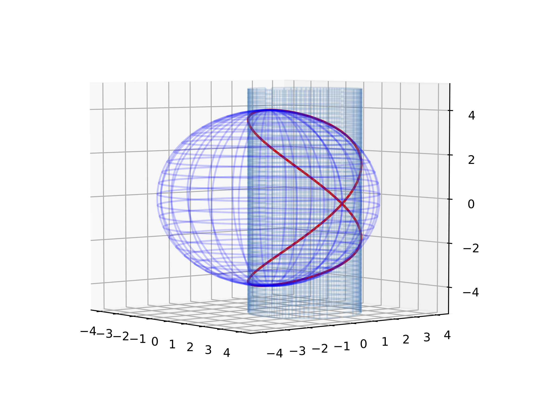 Remarque: La courbe de Viviani (appelée aussi ''fenêtre de Viviani'') est définie comme l'intersection d'une sphère et d'un cylindre qui est tangent à la sphère et passe par le centre de cette dernière :