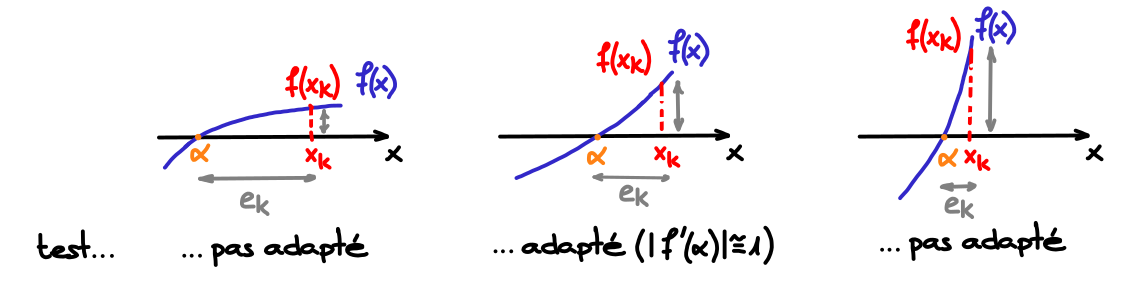 Ce test donne une bonne indication de l'erreur commise lorsque \(|f'(\alpha )|\cong 1\), c'est-à-dire lorsque la fonction varie de manière plus ou moins identique en abscisse et en ordonnée dans un voisinage de \(\alpha\) : on a alors \(|x_k-\alpha|\cong \varepsilon\).