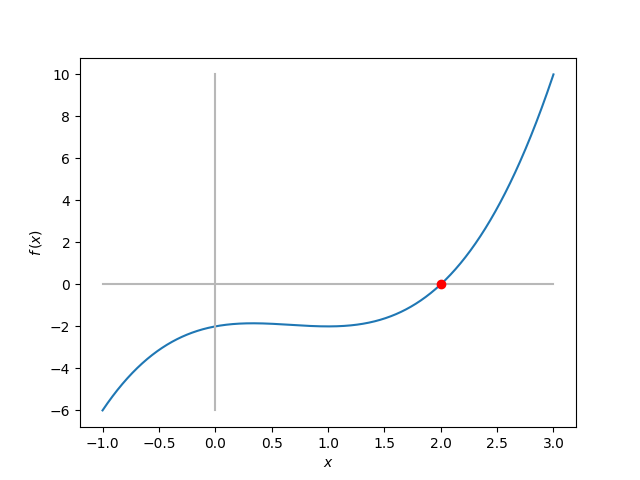 x = optimize.bisect(f,-0.5,2.5,xtol=1e-3,maxiter=100)