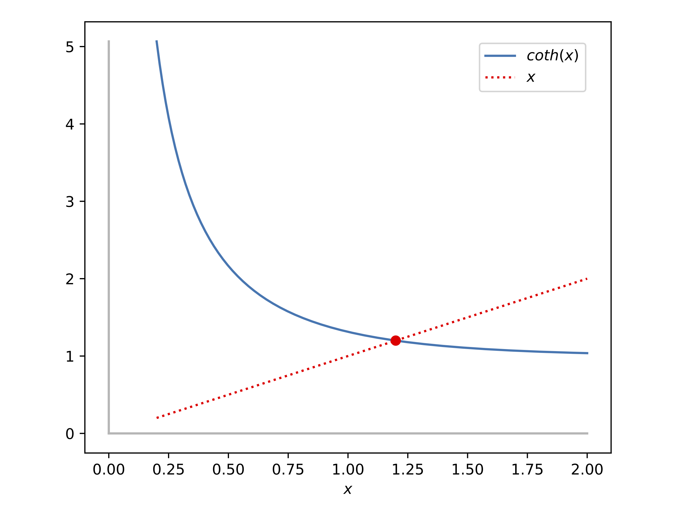 Recherchons par exemple la solution de l'équation \(\coth{(x)}=x\) pour \(x>0\) :